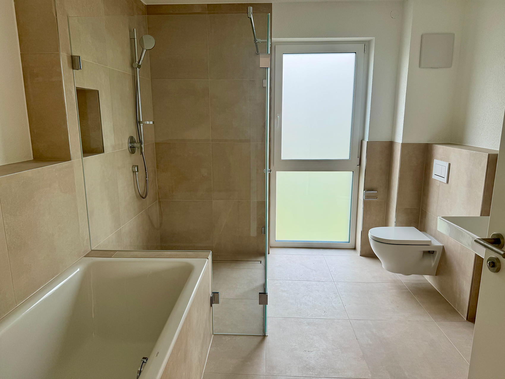 Markenprodukte wie Villeroy & Boch, Hansgrohe & Co. kombiniert mit zeitlosen Oberflächen – stilvoll, langlebig, pflegeleicht.
